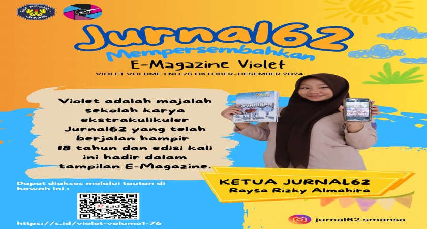 Sekarang malajah VIOLET Volume 1 No. 76 Oktober-Desember 2024 telah hadir kembali dalam tampilan E-Magazine dapat diakses melalui Web SMAN 1 Cianjur atau tautan di bawah ini :